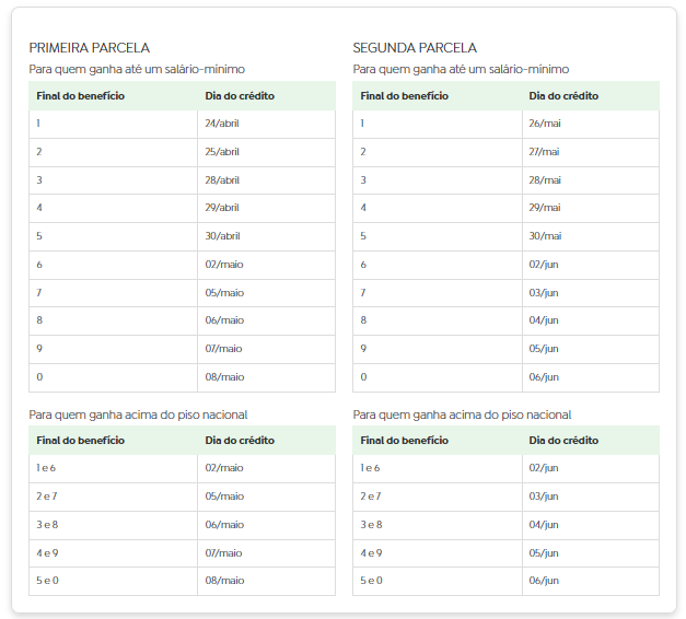 O calendário de pagamentos leva em conta o número final do cartão de benefício, sem considerar o último dígito verificador, que aparece depois do traço. O crédito da primeira parcela do abono será feito entre os dias 24 de abril a 8 de maio. Recebem primeiro os beneficiários que ganham até um salário-mínimo. Os aposentados e pensionistas que recebem acima do piso nacional terão o valor da parcela creditado de 2 a 8 de maio.
